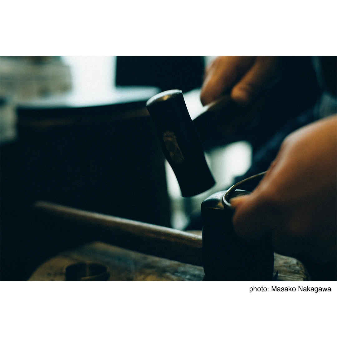 本展のメインピースであるオブジェ〈TOTEM〉の象徴的な真鍮のパーツを制作した金工作家の菊地流架さん。ワークショップでは、菊地さんとともに真鍮を叩いて成形しながら、シンバルを制作。さらにWONDER FULL LIFEが収集したパーツを編みつなぎ、持ち手や飾りをつくっていきます。