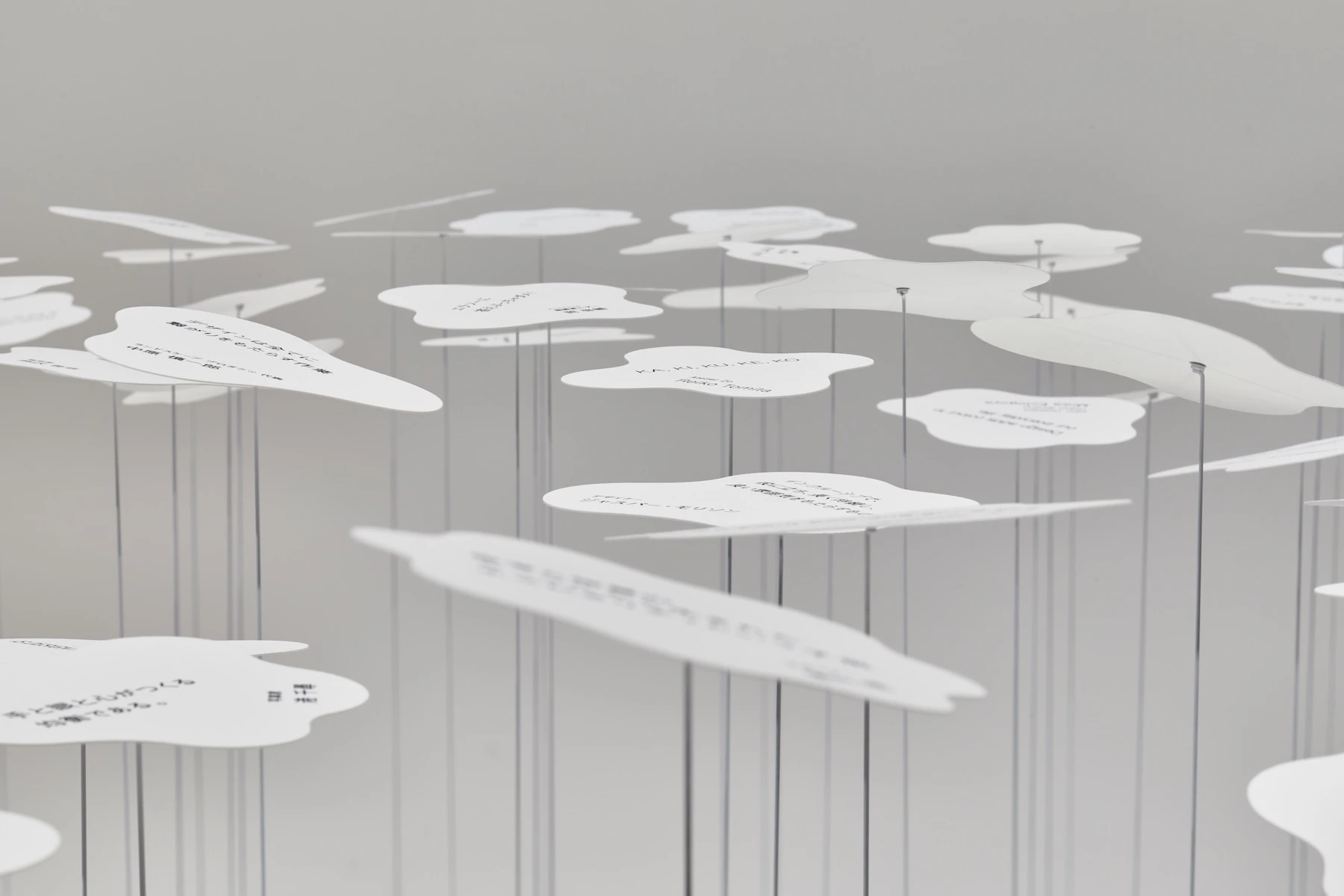 さまざまな地域、世代、職業の方々に、 俳句のように短い言葉で( )の中を表現していただきました。 その言葉たちが、会場に群生しています。