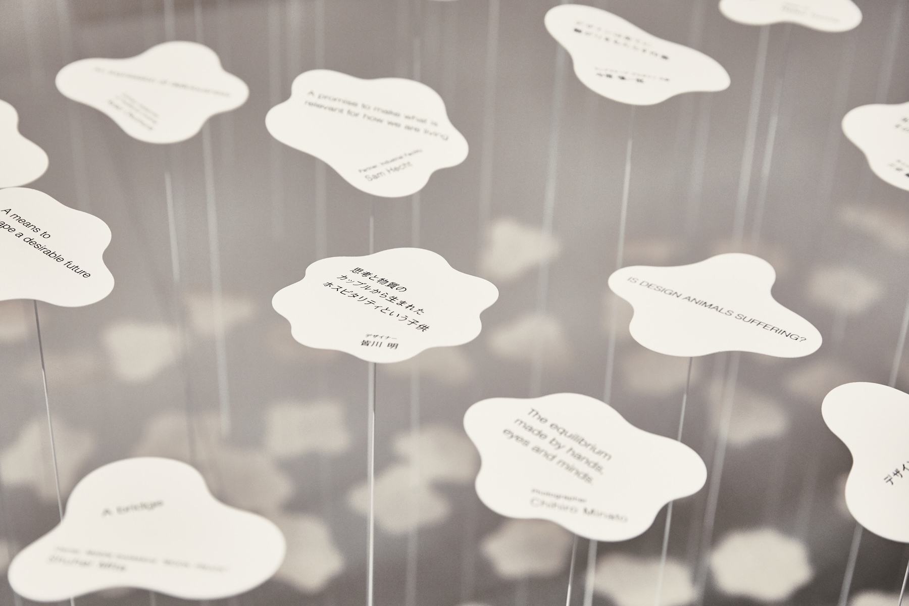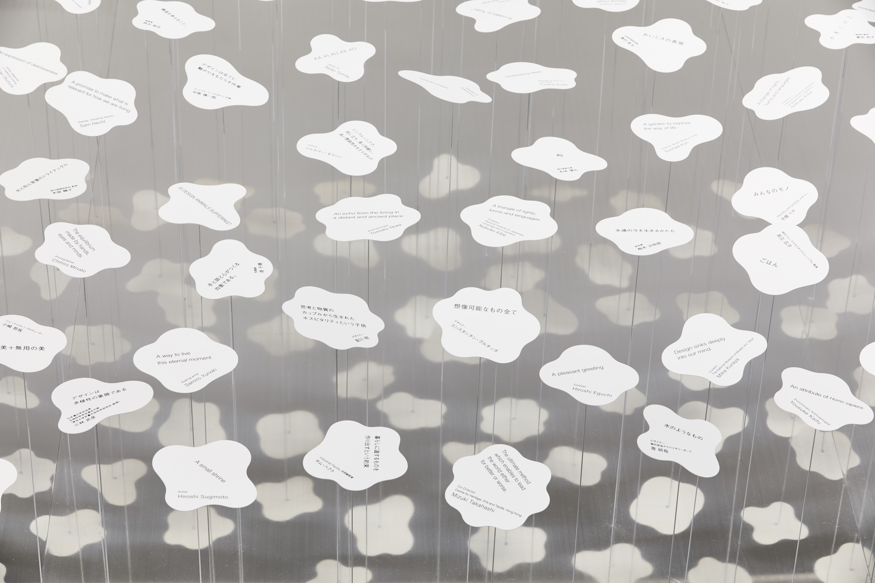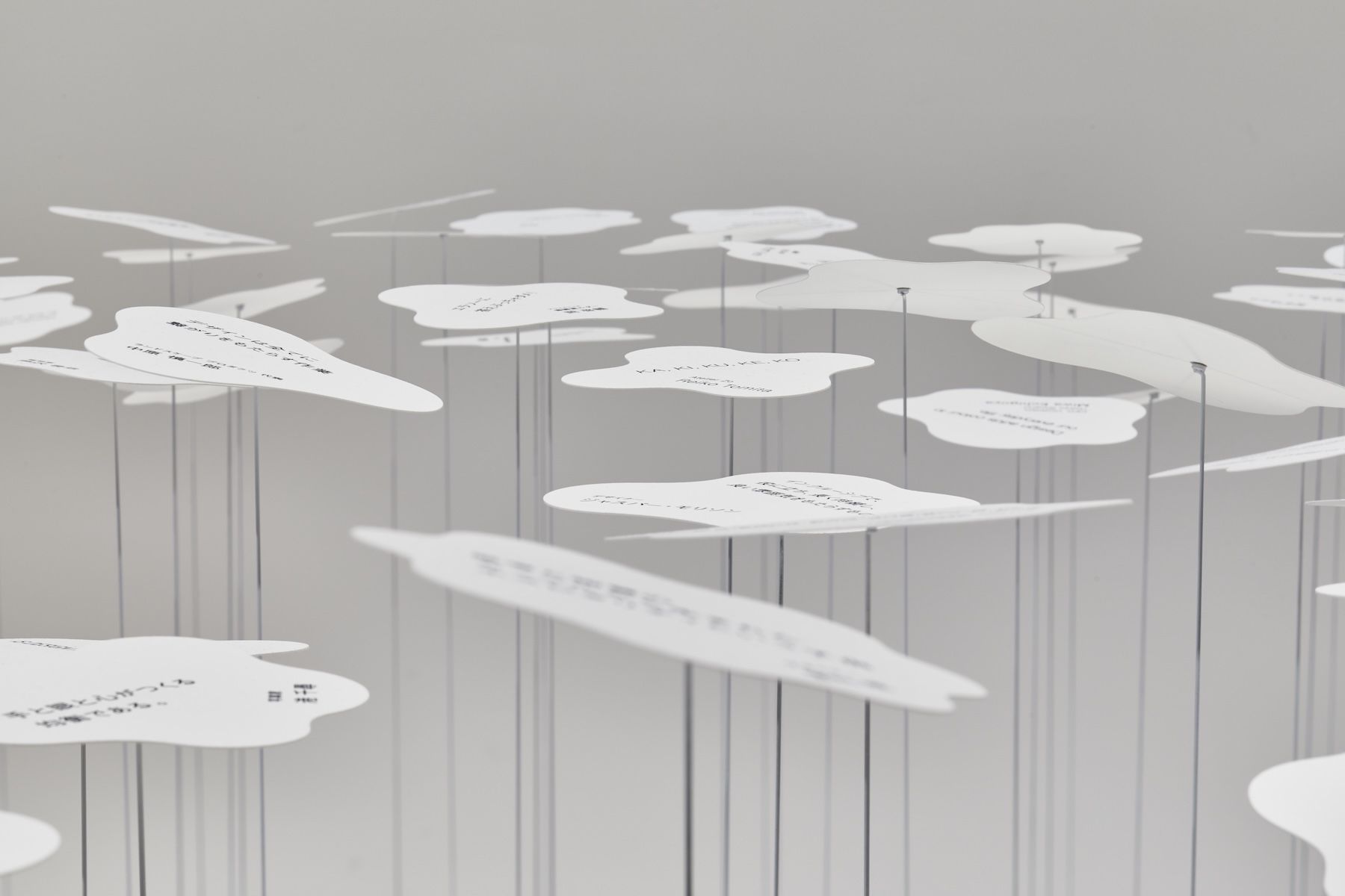 さまざまな地域、世代、職業の方々に、 俳句のように短い言葉で( )の中を表現していただきました。 その言葉たちが、会場に群生しています。