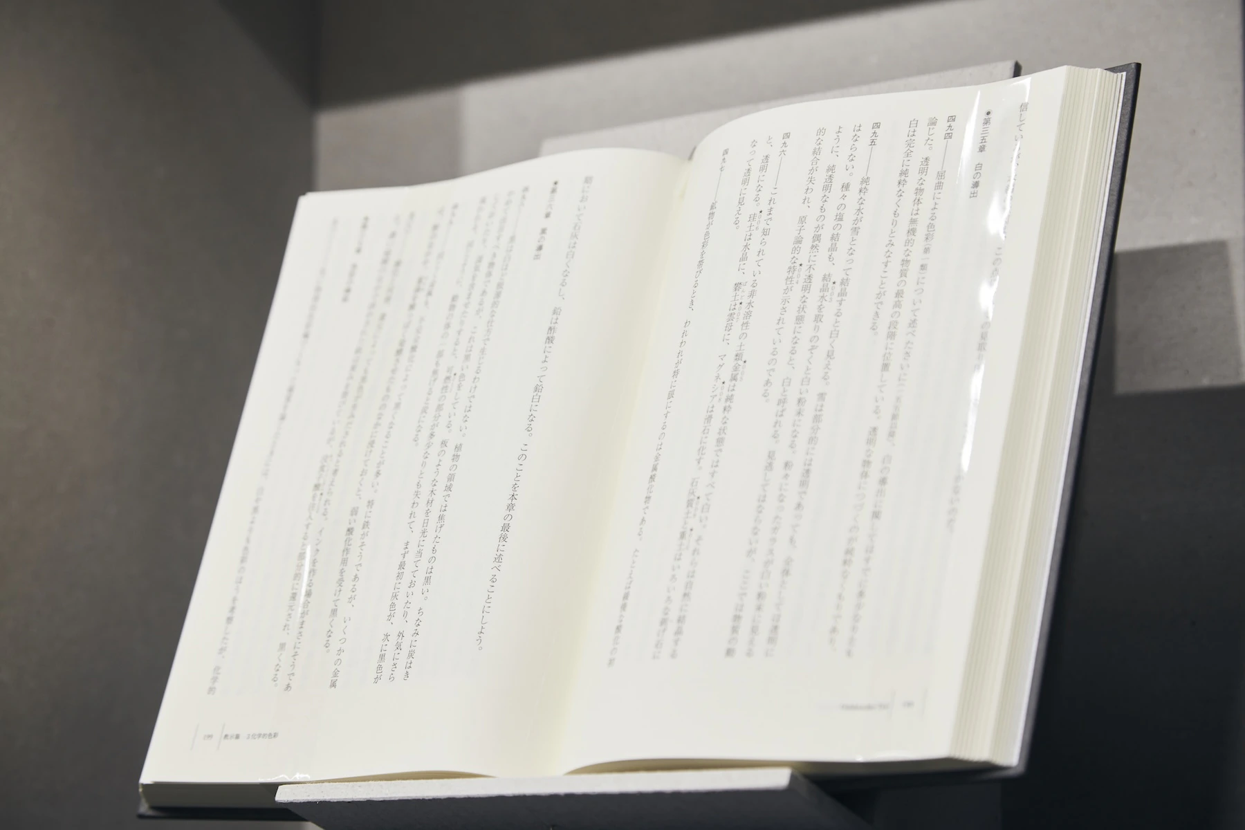 北園克衛の作品が収録された『カバンのなかの月夜』 金澤一志(監修)堀江敏幸(序文)をはじめ、『白の消息 骨壺から北園克衛まで』 山口信博(著)、『色彩論』 ヨーハン・ヴォルフガング・フォン・ゲーテ(著)、『ふすま 文化のランドスケープ』 向井一太郎、向井周太郎(著)など会場内で展示中の書籍の一部も、ここではお手にとって読んでいただけます。ぜひご自由にご覧くださいませ。