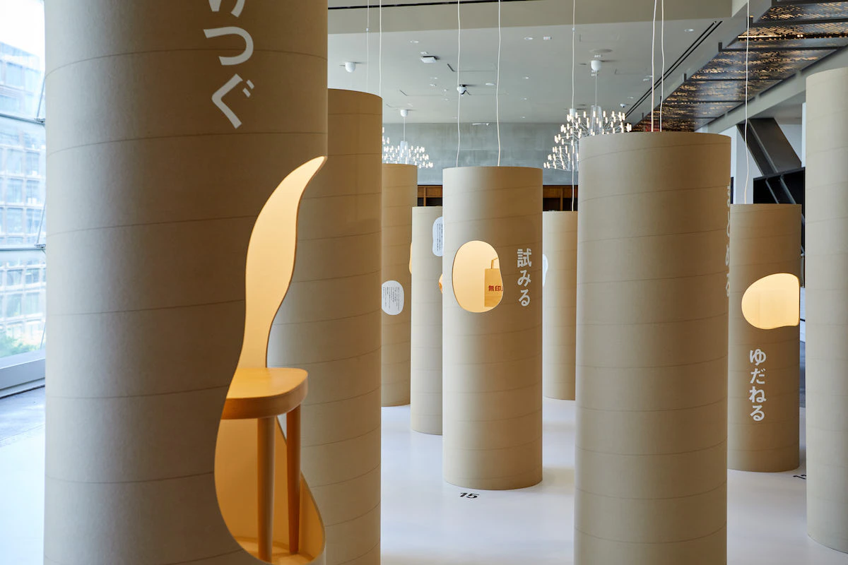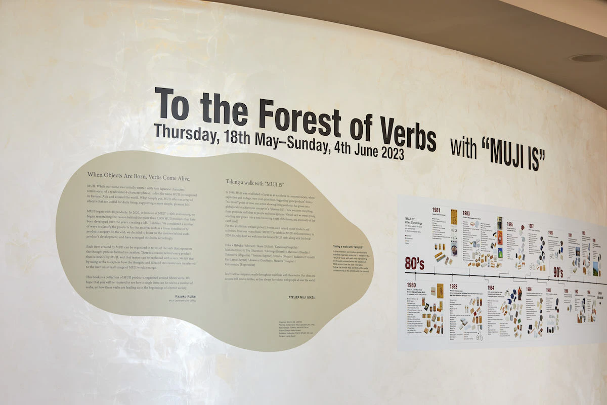 本展では、無印良品誕生から40年を迎えた2020年に出版した書籍『MUJI IS 無印良品アーカイブ』と連動し、本書で取り上げた15の動詞とともに商品や活動を紹介します。