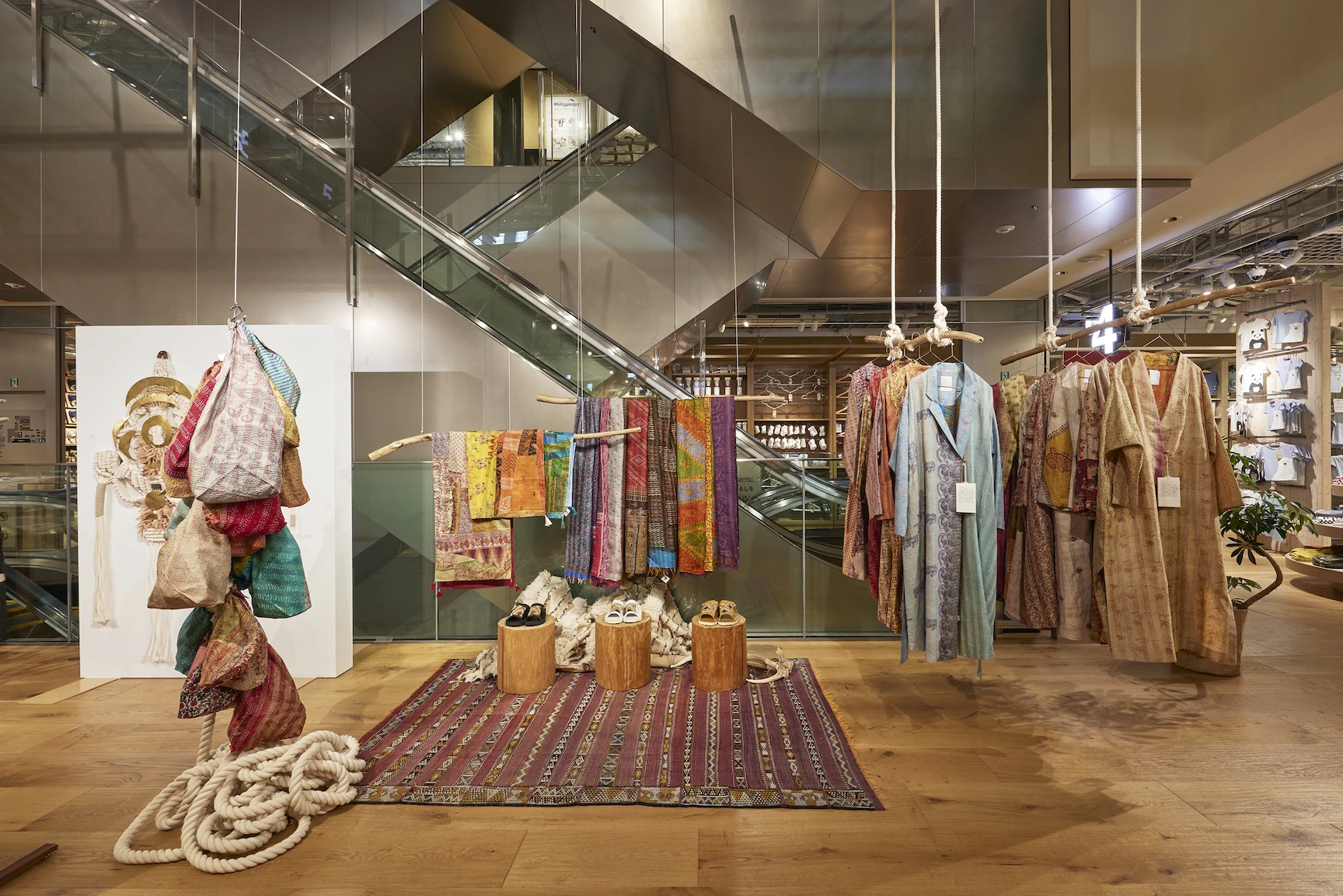 使い込むほど経年変化による味わいが楽しめる、真鍮のカトラリーやアクセサリー。インドの女性が家族の幸福と繁栄を祈って刺し子を施す、「カンタ布」を使ったストールやコート。泥染めと天然染色のあざやかなカラーが目を引く、マクラメのポシェットや布地のバッグ。アフリカ・コンゴ中央部のショワ族がつくる伝統的な草ビロード、「クバ布」の貴重なヴィンテージ生地をあしらったサンダル。