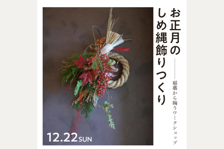 今年収穫した稲藁を使ってしめ縄を一緒に綯い、自然のままに育った松や南天など古くからの云われの縁起物で飾りつけ、新たなる年をわくわく願いながら作りましょう。ワークショップと一緒に、福岡県太宰府梅園の「東風梅」をお召し上がり頂くお茶会も行います。